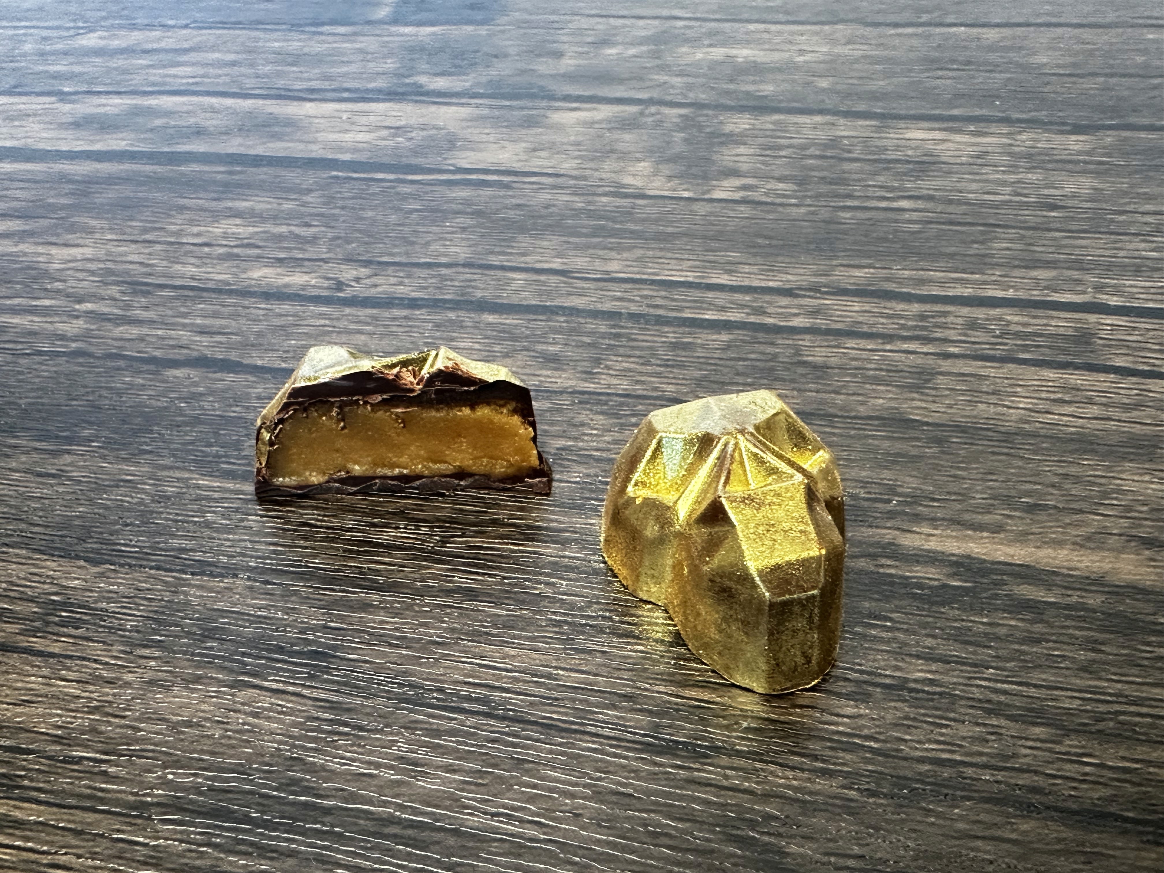 California foraged candy cap mushroom powder and Vermont maple syrup caramel with hickory smoked sea salt in 74% dark chocolate.